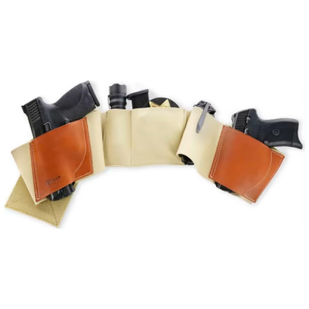 Galco's traditional belly band allows concealed carry of multiple weapons and accessories around the midsection, in an infinite variety of configurations. The UnderWraps also enables the user to make instant additions and changes to the carry rig. Two leather holster pockets facilitate stable positioning of one or two firearms simultaneously, while two accessory pockets accommodate badge, cuffs, ammo, etc. The UnderWraps can be worn like a traditional belly band (low on the waistline, partially under the beltline or just above it) or it can be worn around the torso's mid-section (around the solar plexus area). The UnderWraps accommodates both right and left hand draw, strongside, crossdraw and appendix carry, with butt-forward and barrel-forward cants.