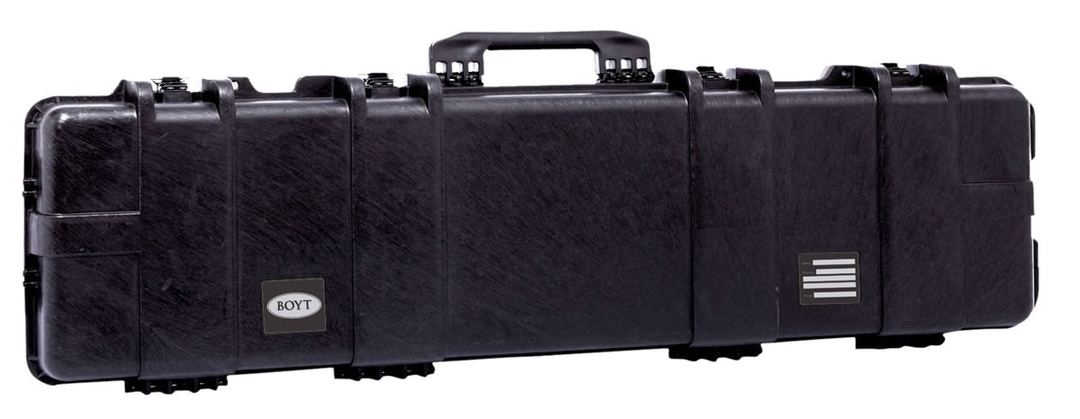 Boyt Harness Company's hard-sided travel case is designed and engineered to meet or exceed law enforcement, military and airline standards. The H-Series is constructed of high 120D no break polypropylene and features a water resistant and dust proof o-ring full length gasket, stainless steel ball bearing wheels, and pressure relief valve. The case is padlock compatible, has collapsible, comfort grip handles, and meets most standard airline luggage/TSA requirements. It is padlock compatible. This model holds two rifles, has a black finish, and internal dimensions of 51" x 15" x 6". Made in the USA.
