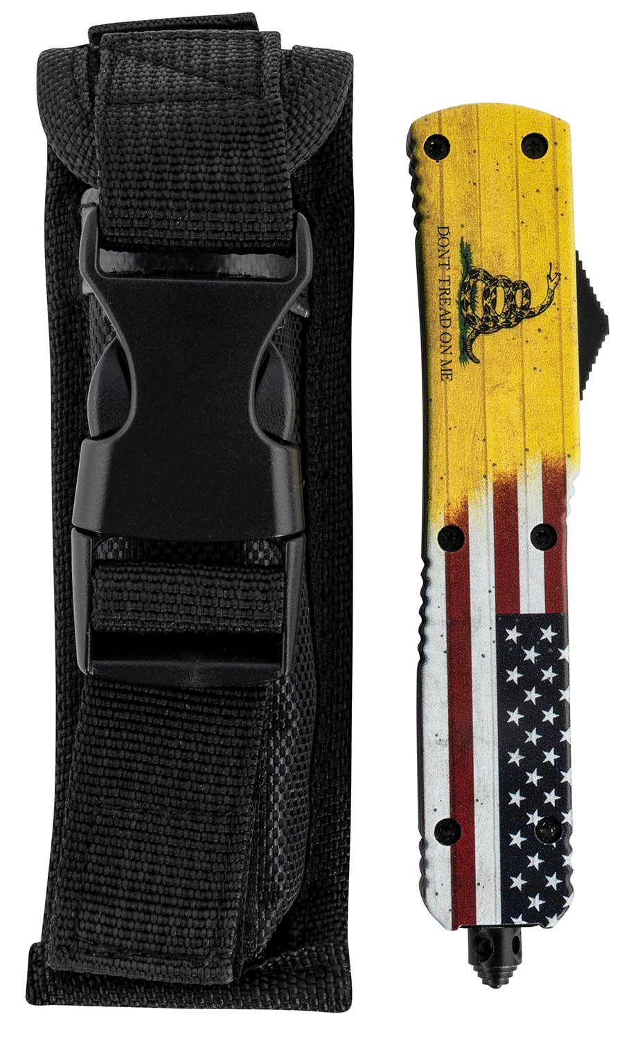 Templar Knife MDTOM331 Gen II Dont Tread On Me Slim 3.50" OTF Drop Point Plain Black Oxide Stonewashed 440C SS Blade, 5.05" Yellow w/Flag & "Dont Tread On Me" Aluminum Handle, Glass Breaker