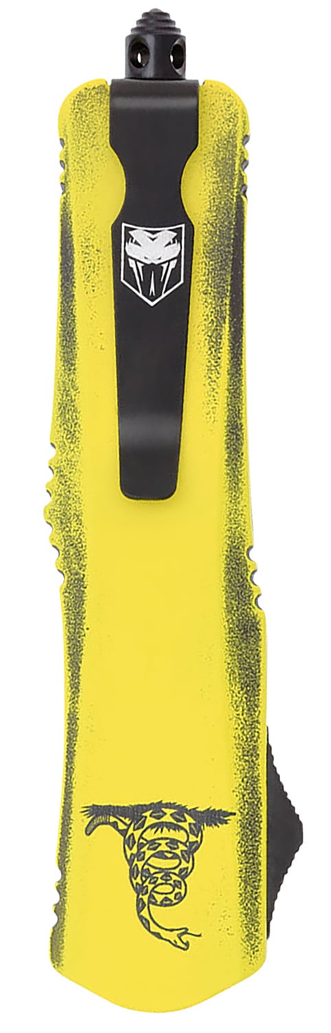 CobraTec Knives MDTOMFS3DNS FS-3 Dont Tread On Me Medium 3" OTF Drop Point Plain D2 Steel Blade Yellow w/"Dont Tread On Me" Aluminum Cerakoted Handle Features Glass Breaker Includes Pocket Clip