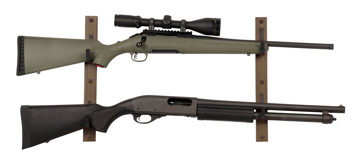 The Gun Collector Gun Rack is the must-have storage device. The durable long gun rack features extra gun space, sized to store up to 2 firearms. The hardwood base provides a traditional rustic feel, made as a perfect display to add to your gun collection! The gun rack is made of two hardwood bases, made to provide ultimate support for your firearms. The hooks are made of powder coated steel to cradle the guns without damaging the finish. Each frame contains 2 padded steel hooks, sized to hold up to 30-pounds. Complete assembly with the provided mounting screws and wall anchors.