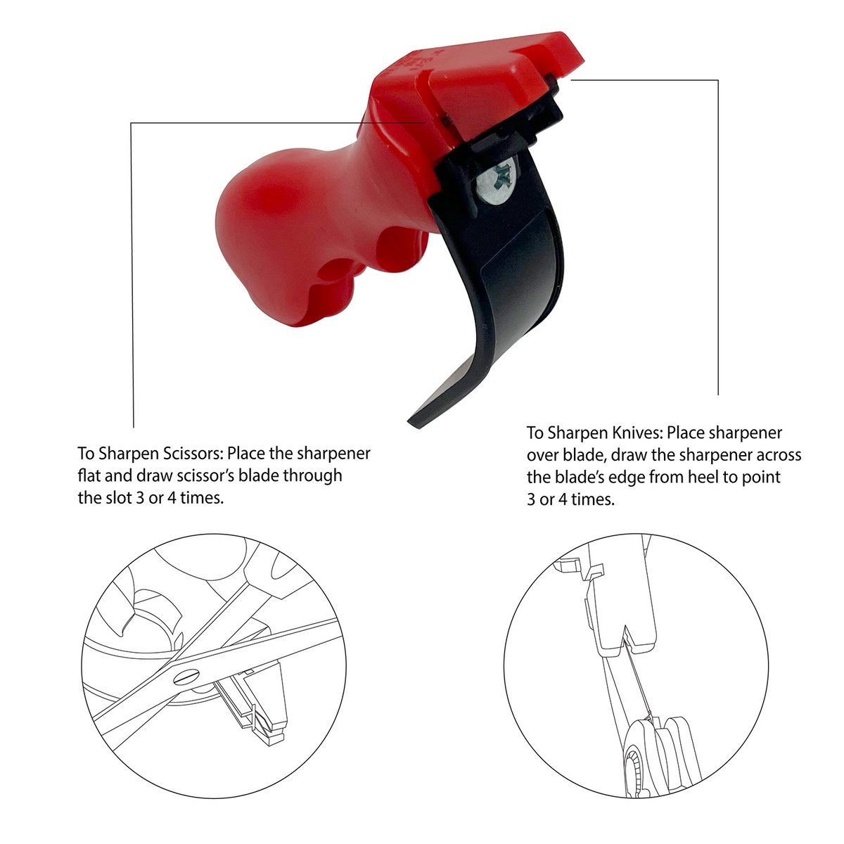 The Knife & Scissor Sharpener is excellent for sharpening knives and scissors. The diamond honed carbide inserts sharpen the dullest knives in a few strokes.