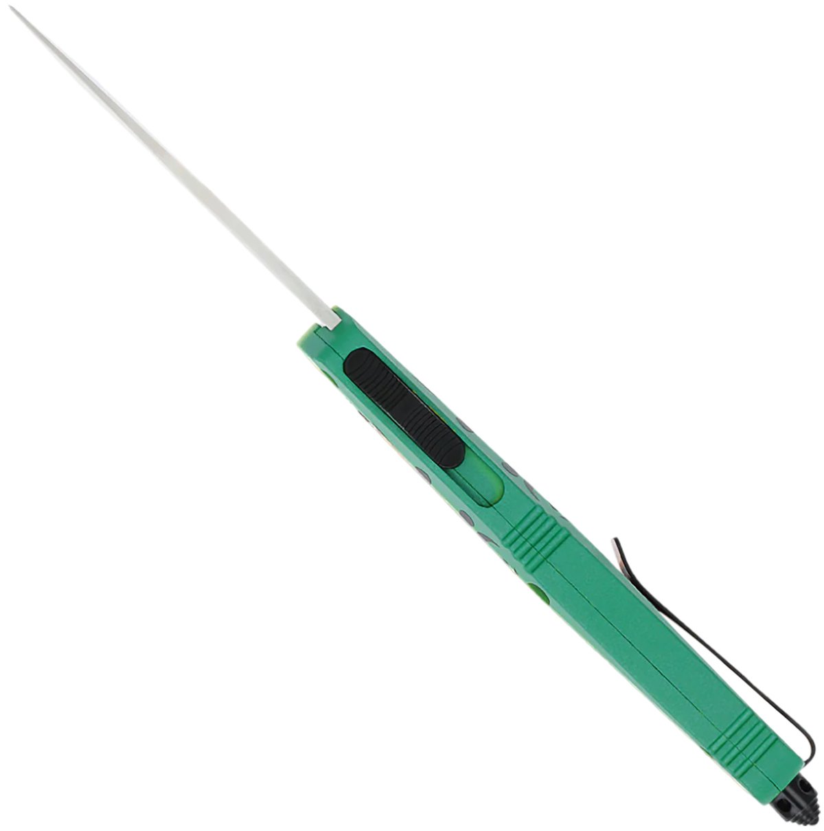 The "Green Lure" is a dual action OTF knife that begins with a aluminum alloy handle that is custom designed and Cerakoted. Loaded with a high quality CNC machined D2 steel blade. Featuring an Iconic Fishing Lure custom design in blue on both sides. The clip is ambidextrous as the pocket clip can be switched to either side allowing for RH or LH use. Comes with a glass breaker for emergencies and also include a nylon sheath.