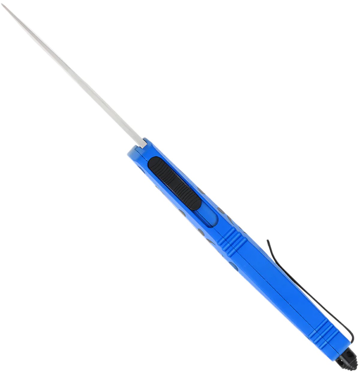 The "Green Lure" is a dual action OTF knife that begins with a aluminum alloy handle that is custom designed and Cerakoted. Loaded with a high quality CNC machined D2 steel blade. Featuring an Iconic Fishing Lure custom design in blue on both sides. The clip is ambidextrous as the pocket clip can be switched to either side allowing for RH or LH use. Comes with a glass breaker for emergencies and also include a nylon sheath.