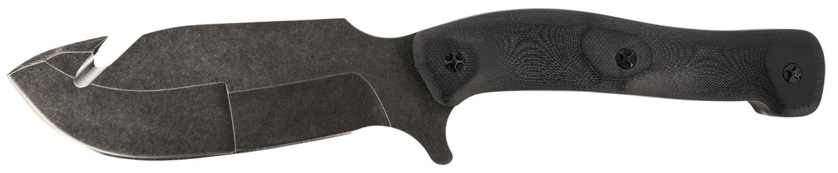 The Templar Reagan Field Dressing skinning/gutting knife was designed by an Animal/Meat Scientist with an emphasis on beef quality. A gut-hook combined with a thicker blade heel enhances the ease of a full-cavity evisceration process. The blade is designed with a gradual decrease in thickness from heel to tip creating the dual purpose of segmenting sternums to skinning. The ergonomic lightweight handle with finger grooves is designed with a guard on top and bottom allowing for a more comfortable thumb or hand heel placement for leverage of the heel and gut hook in an edge in or edge out grip.