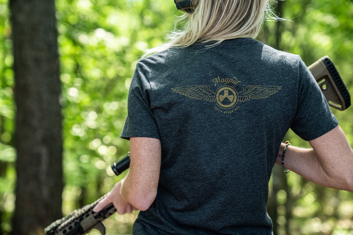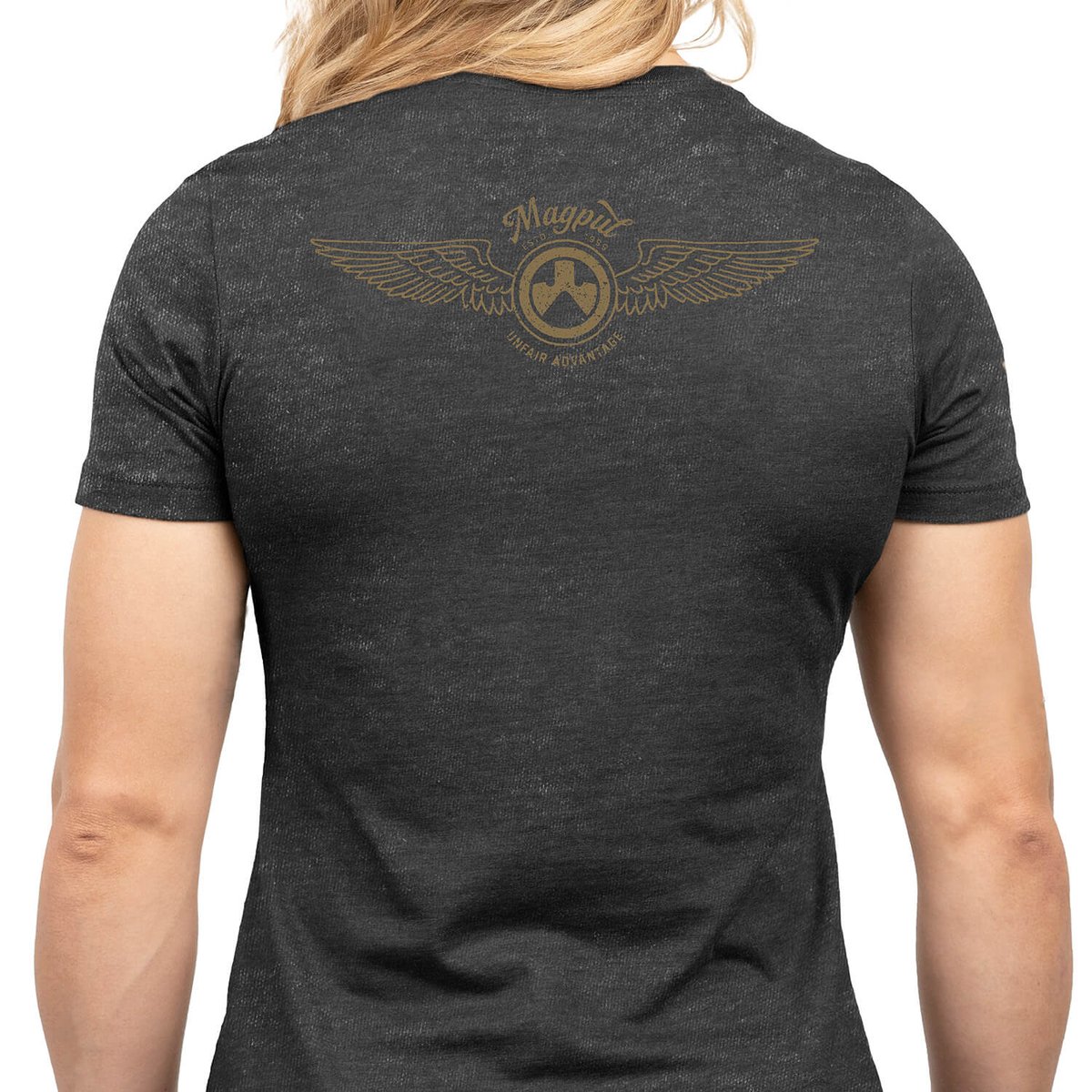 Magpul Women's Take Flight T-shirt is made with 52% combed ring-spun cotton/48% polyester. Featuring a short sleeve, V-neck, tagless interior, shoulder to shoulder neck tape, double-needle stitching on hems and sleeves. Printed in the USA.