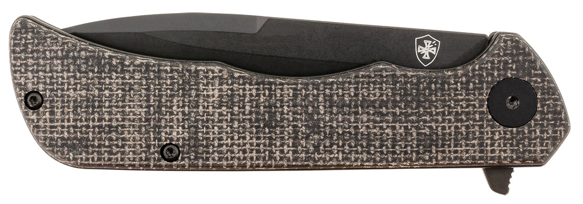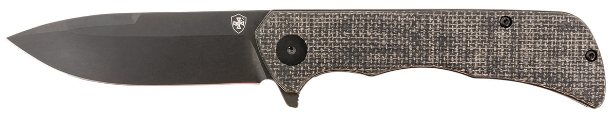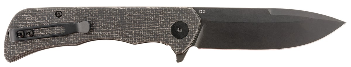 Paladin Linerlock folder features a black powder coated D2 steel blade and a Micarta handle. Includes pocket clip.