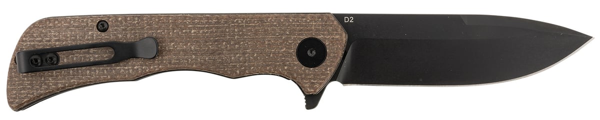 Paladin Linerlock folder features a black powder coated D2 steel blade and a Micarta handle. Includes pocket clip.