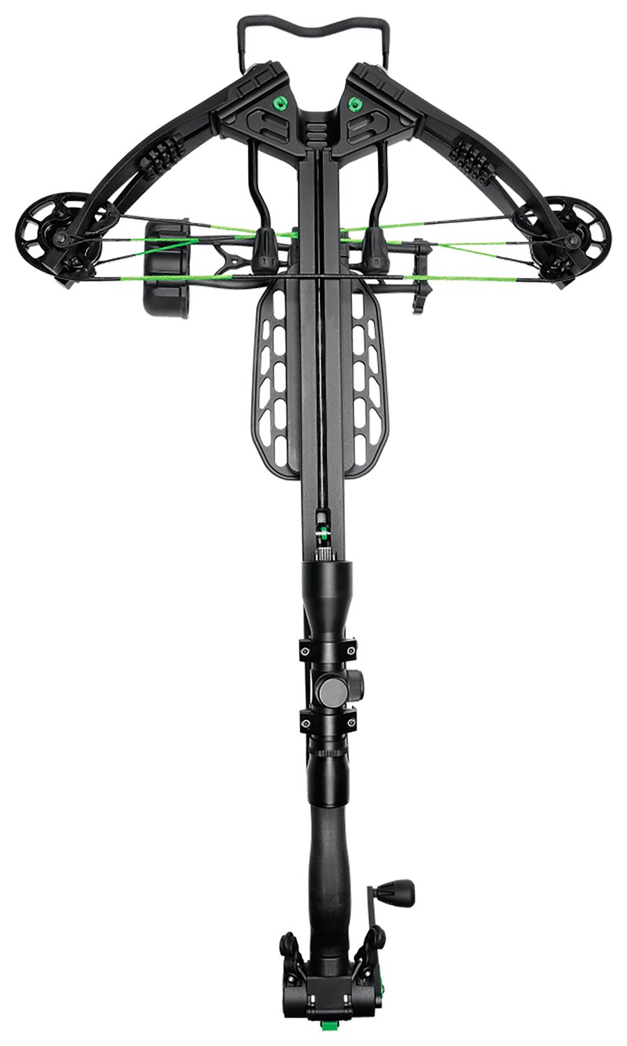 - Full Accessory Package includes a detachable silent crank adjustable ergonomic foregrip 4x32mm scope oversized stirrup and three (3) 20-inch .003 carbon arrows and quiver