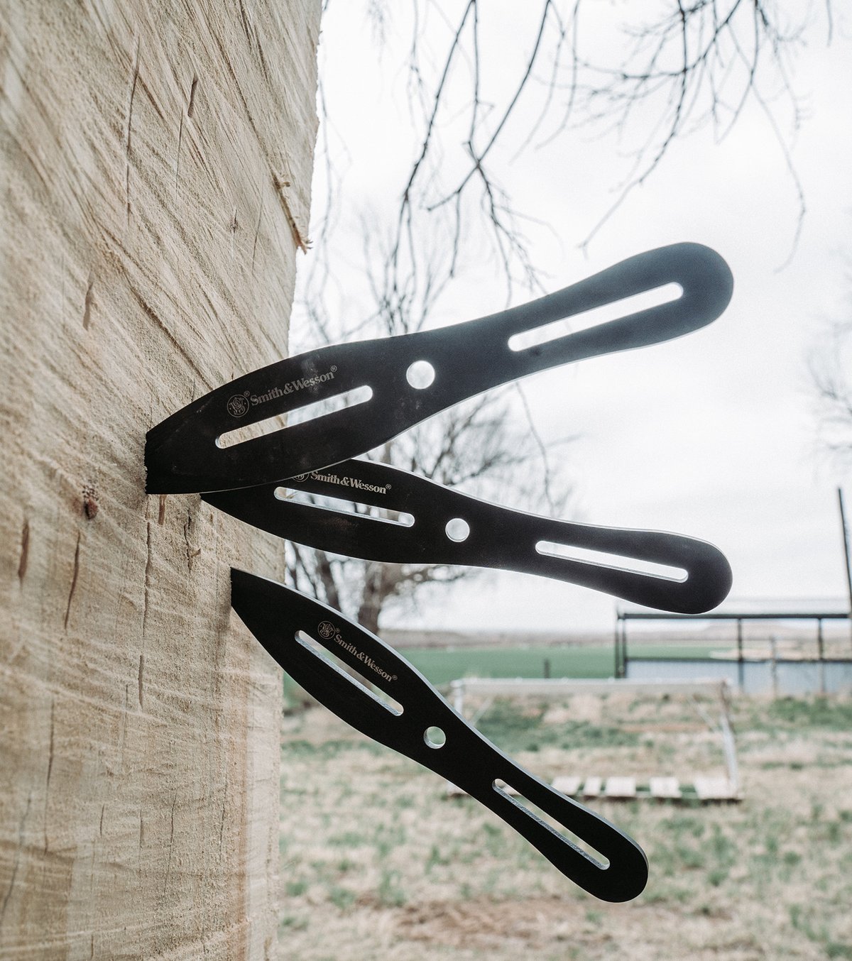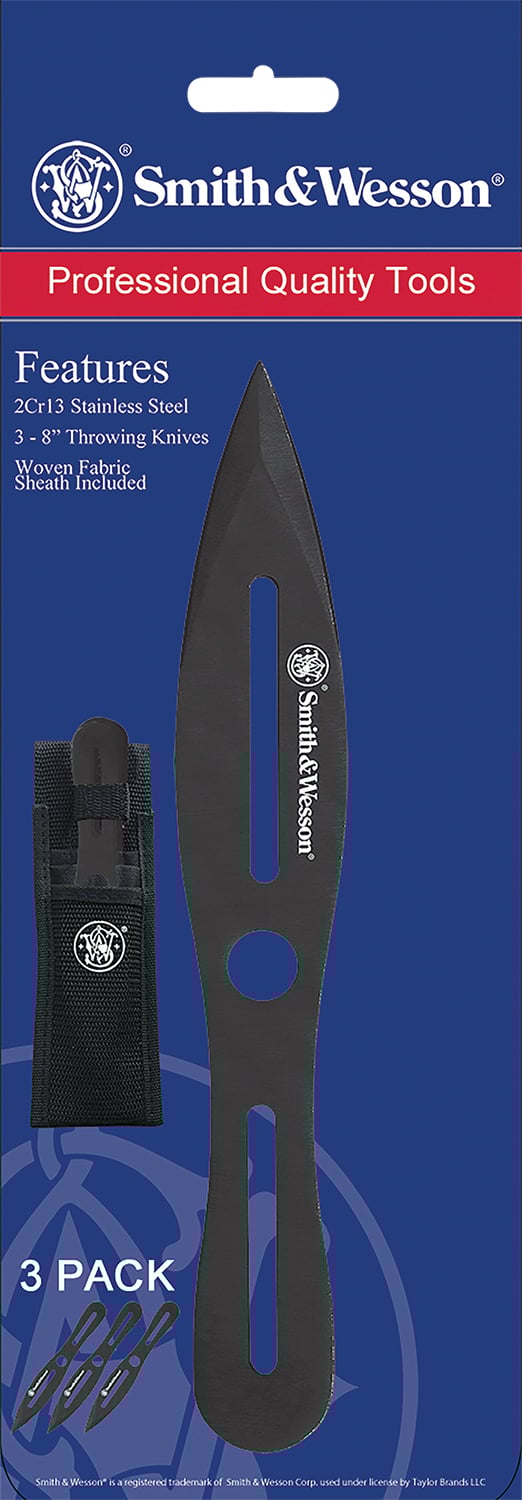 Smith & Wesson 3 pack of 8" throwing knives are made from a stainless-steel dual edged spear point blades. Includes a black polyester belt sheath.